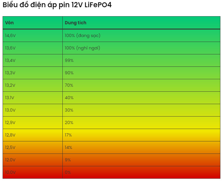 - Điện áp danh định: 3.2V, 12V, 12.8 V, 25.6V