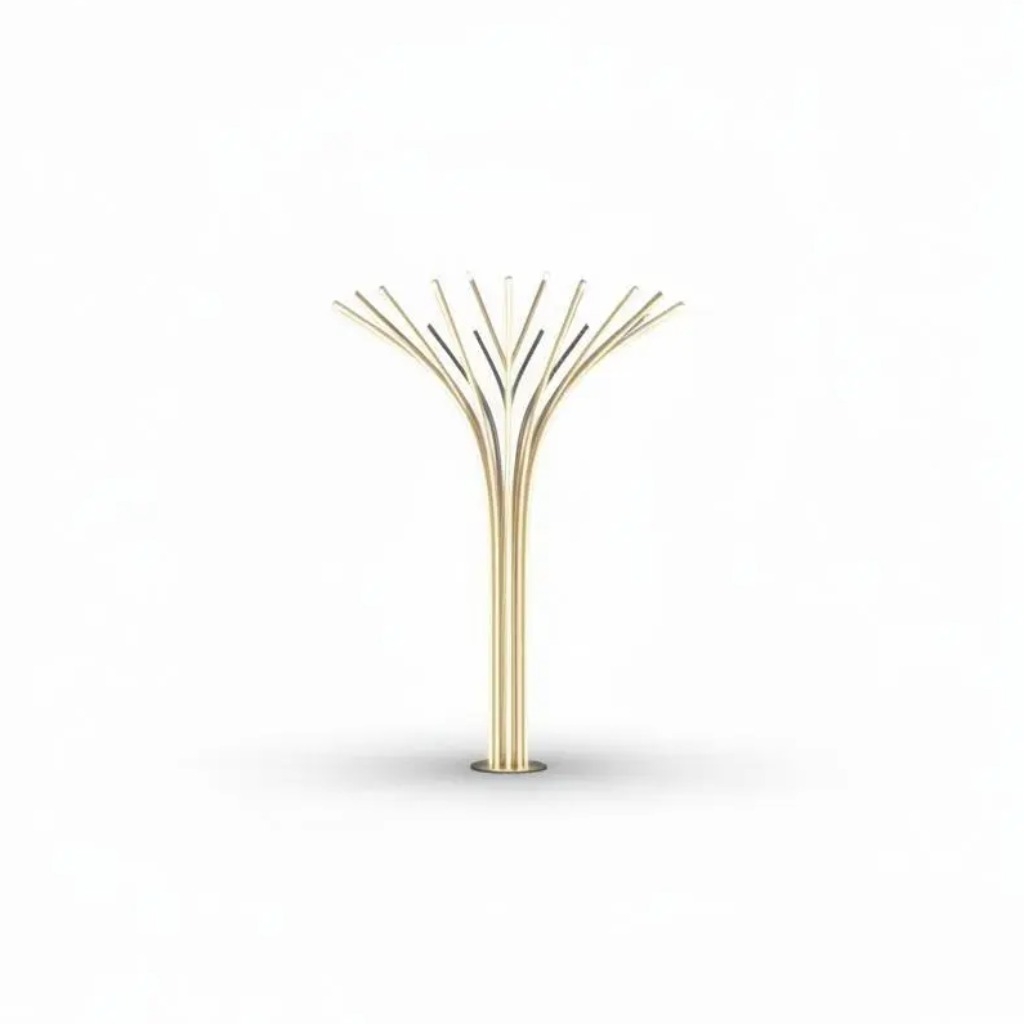🎨 Minimalist modern LED Tree Light structure, multiple glowing slender branches, golden metallic pole finish, soft warm white LED dots on tips, pure white studio background, 8k resolution, cinematic lighting --ar 1:1