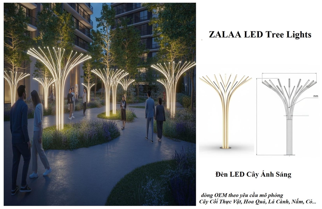 [Giới thiệu tổng quan]: Trong xu thế phát triển đô thị thông minh và bền vững hiện nay, việc chiếu sáng không chỉ dừng lại ở công năng dẫn đường mà còn đóng vai trò kiến tạo linh hồn cho cảnh quan về đêm. Đèn LED Cây Ánh Sáng ZL-LDT-M01 của Công ty Cổ Phần ZALAA Việt Nam là dòng sản phẩm tiên phong kết hợp giữa công nghệ LED hiện đại và ngôn ngữ thiết kế mô phỏng sinh học (Biomimetic Design). Với cấu trúc phân nhánh thanh thoát, sản phẩm tạo nên một hệ sinh thái ánh sáng sống động, biến các không gian công cộng, quảng trường hay khu resort thành những tác phẩm nghệ thuật ánh sáng đầy mê hoặc. Sản phẩm được sản xuất và lắp ráp theo quy trình kiểm soát chất lượng chặt chẽ, đáp ứng các tiêu chuẩn TCVN và IEC hiện hành, đảm bảo sự bền bỉ tuyệt đối trong điều kiện khí hậu nhiệt đới khắc nghiệt.